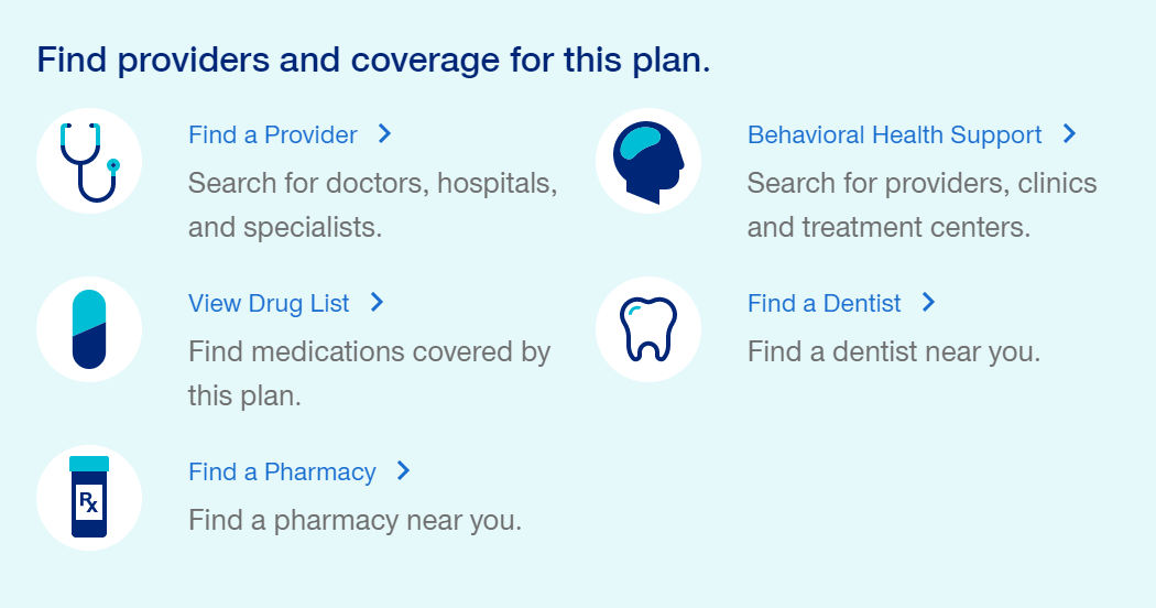 - Select the “Drug List” in the blue provider search box to see prescriptions covered by that plan